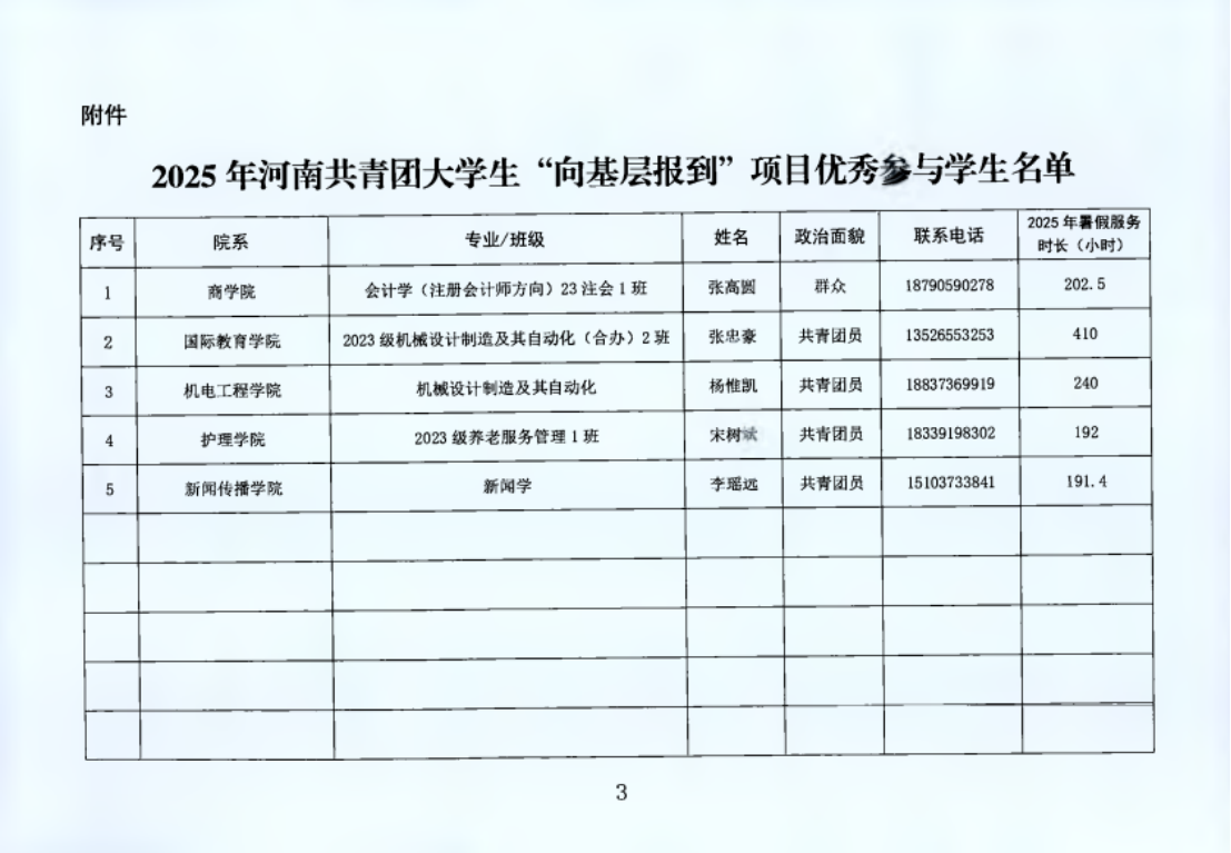 近日,共青团河南省委公布了2025年河南共青团大学生“向基层报到”项目活动优秀参与学生名单,我校张高圆 A片高清播放,张忠豪,杨惟凯,宋树斌,李瑶远5名同学获评“优秀参与学生”荣誉称号。