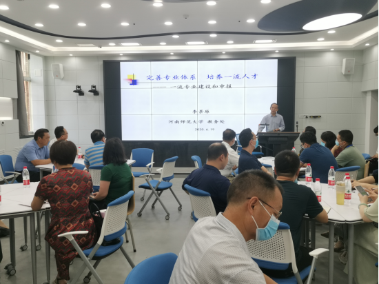 6月19日上午9:30,我校在A05智慧教室召开河南省“一流专业”建设和申报专题报告会,特邀河南省高校科学技术带头人,生物学学科领域专家,中国植物学会结构学专业委员会委员,河南省植物学会副理事长,河南师范大学教务处副处长李景原教授来校作培训报告 7c7pcc视频,报告会由教务处处长夏锦红主持,各学院院长,教学副院长及部分专业教师30余人参加。